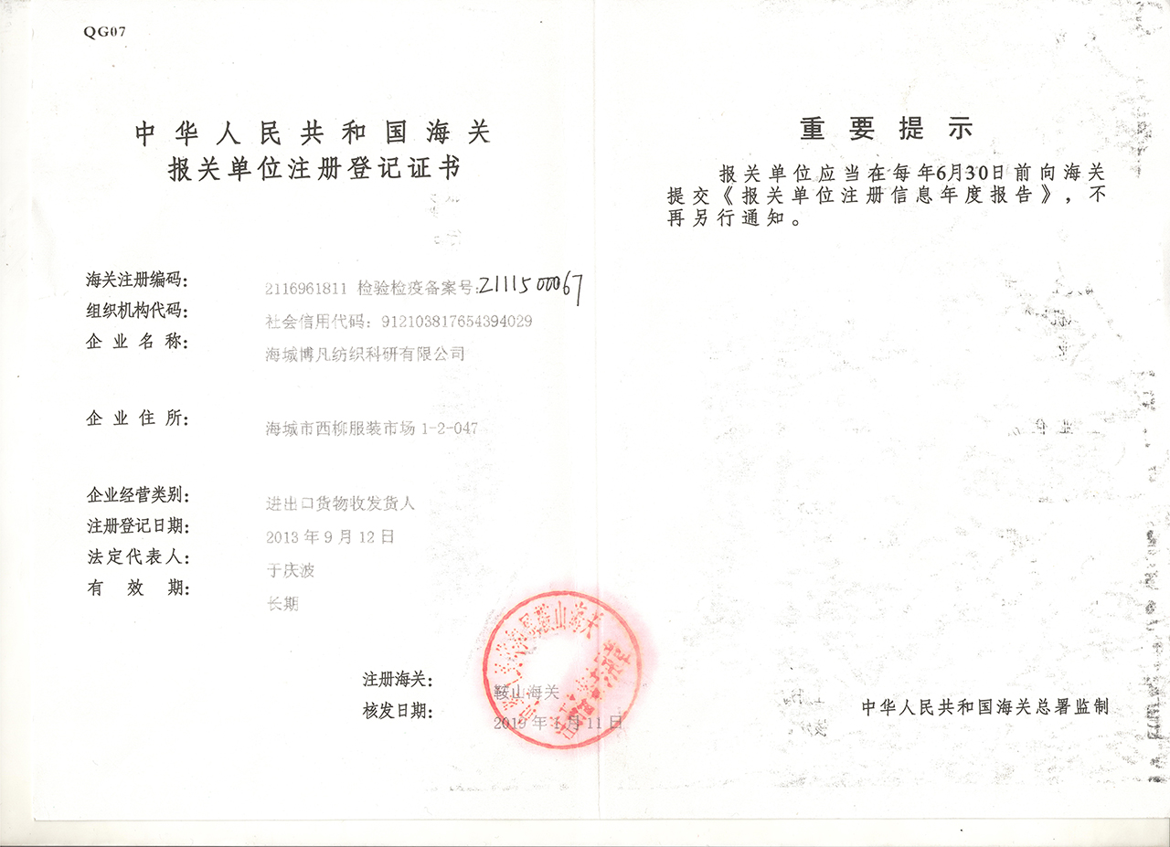 中華人民共和國海關(guān)報(bào)關(guān)單位注冊登記證書 |
