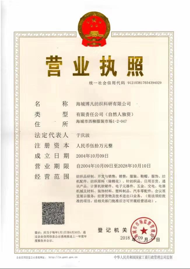 | Company | Haicheng Bofan Textile Technology Co., Ltd. | Cellphone | 139-0980-2920 | TEL | 0412-385-5949 |